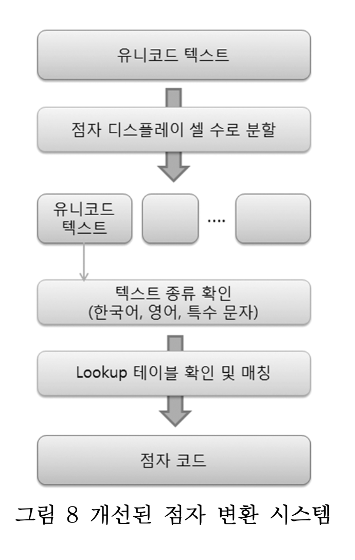 점자 디스플레이(flexible braille display)를 통하여 EPUB 규격에서 추출된 텍스트를 전달하기 위해서 텍스트를 점자로 변환하는 알고리즘이 필요하다.