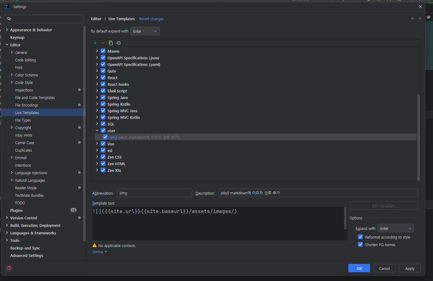 - intellij의 live template 기능을 사용해 1번의 깃헙에 업로드한 이미지 경로를 ‘jimg+tab’을 입력해 사용할 수 있도록 설정